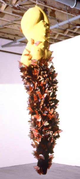 Monarch, 1996 flocked hollow plaster torso with folded paper & acetate butterlies pinned to a formwork, felt, hair 78" x 22" x 18"